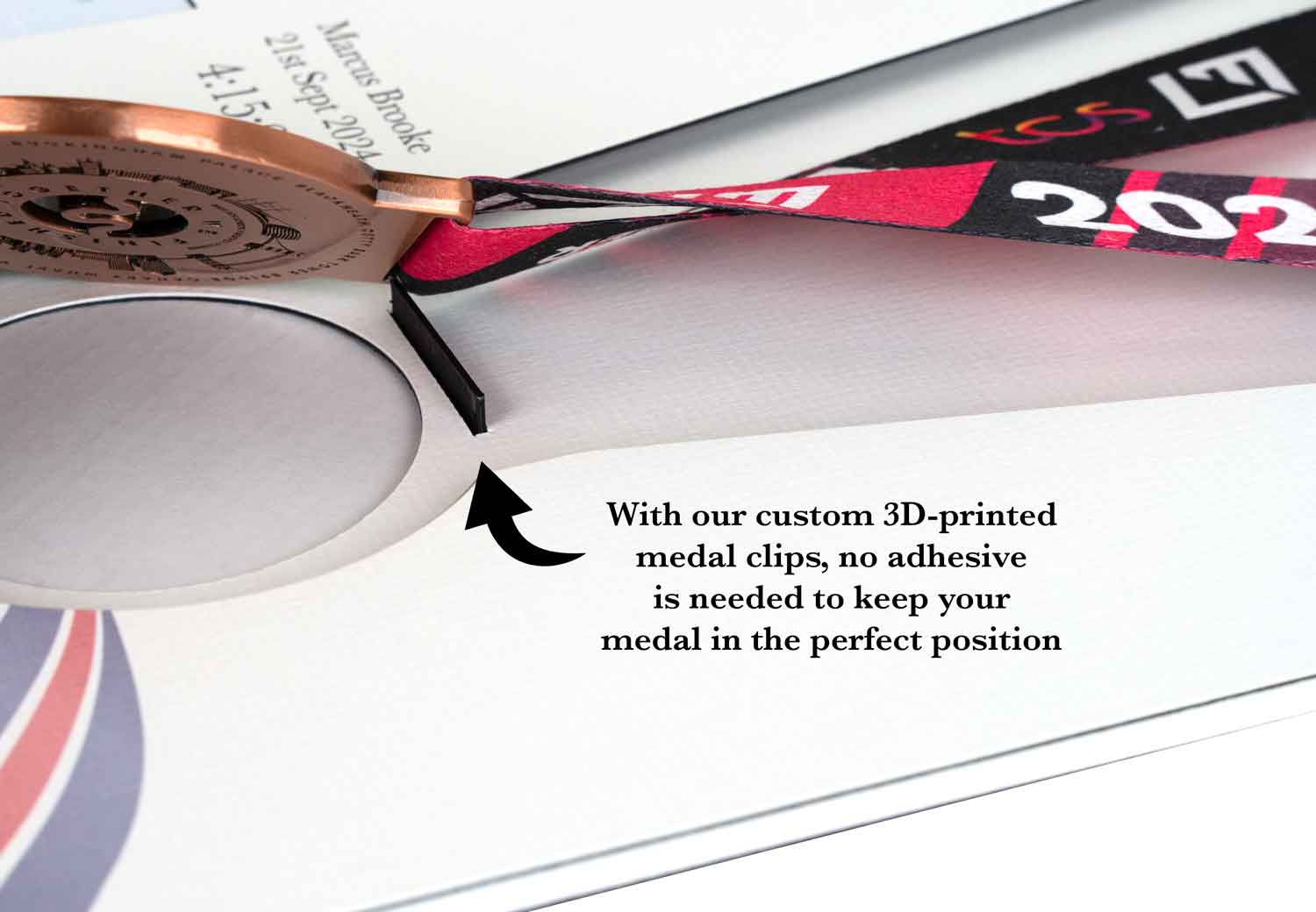 • Medal fits on a custom clip so no adhesive needed